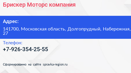 Брискер-Моторс, компания по адресу 141700, Московская область, Долгопрудный, Набережная, 27 в дальнейшем Организация, размещена в следующих категориях: