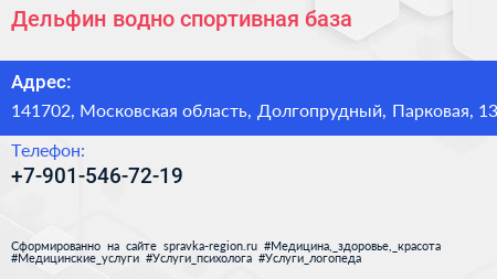 Дельфин, водно-спортивная база по адресу 141702, Московская область, Долгопрудный, Парковая, 13 в дальнейшем Организация, размещена в следующих категориях: