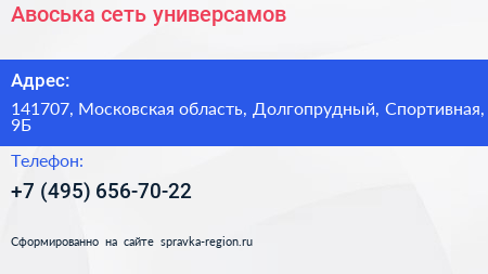 Авоська, сеть универсамов по адресу 141707, Московская область, Долгопрудный, Спортивная, 9Б в дальнейшем Организация, размещена в следующих категориях: