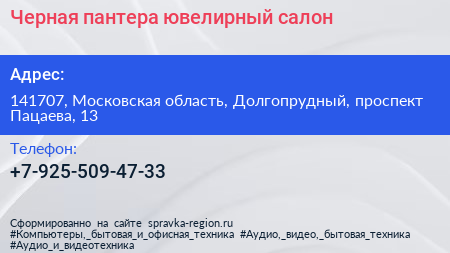 Черная пантера, ювелирный салон по адресу 141707, Московская область, Долгопрудный, проспект Пацаева, 13 в дальнейшем Организация, размещена в следующих категориях: