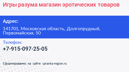 Игры разума, магазин эротических товаров по адресу 141701, Московская область, Долгопрудный, Первомайская, 50 в дальнейшем Организация, размещена в следующих категориях:
