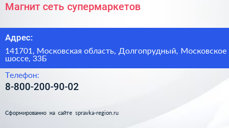 Магнит, сеть супермаркетов по адресу 141701, Московская область, Долгопрудный, Московское шоссе, 33Б в дальнейшем Организация, размещена в следующих категориях: