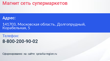 Магнит, сеть супермаркетов по адресу 141703, Московская область, Долгопрудный, Корабельная, 5 в дальнейшем Организация, размещена в следующих категориях: