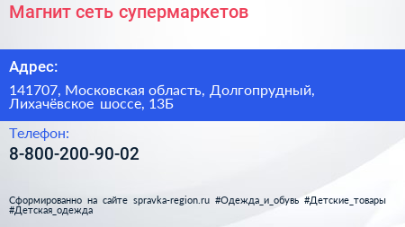 Магнит, сеть супермаркетов по адресу 141707, Московская область, Долгопрудный, Лихачёвское шоссе, 13Б в дальнейшем Организация, размещена в следующих категориях: