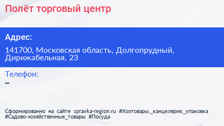 Полёт, торговый центр по адресу 141700, Московская область, Долгопрудный, Дирижабельная, 23 в дальнейшем Организация, размещена в следующих категориях:
