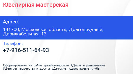 Ювелирная мастерская по адресу 141700, Московская область, Долгопрудный, Дирижабельная, 13 в дальнейшем Организация, размещена в следующих категориях: