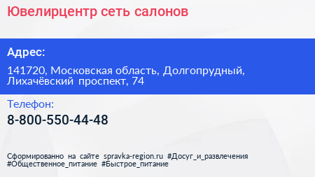 Ювелирцентр, сеть салонов по адресу 141720, Московская область, Долгопрудный, Лихачёвский проспект, 74 в дальнейшем Организация, размещена в следующих категориях: