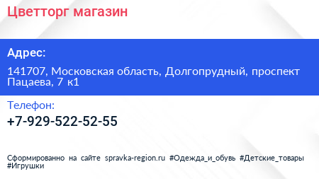 Цветторг, магазин по адресу 141707, Московская область, Долгопрудный, проспект Пацаева, 7 к1 в дальнейшем Организация, размещена в следующих категориях: