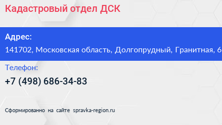 Кадастровый отдел ДСК по адресу 141702, Московская область, Долгопрудный, Гранитная, 6 в дальнейшем Организация, размещена в следующих категориях: