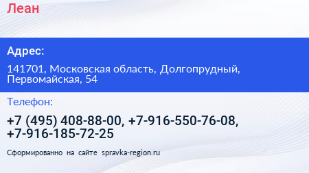 Леан по адресу 141701, Московская область, Долгопрудный, Первомайская, 54 в дальнейшем Организация, размещена в следующих категориях:
