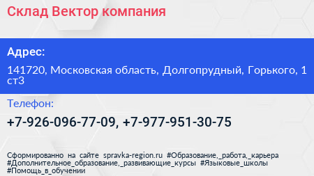 Склад-Вектор, компания по адресу 141720, Московская область, Долгопрудный, Горького, 1 ст3 в дальнейшем Организация, размещена в следующих категориях: