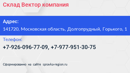 Склад-Вектор, компания по адресу 141720, Московская область, Долгопрудный, Горького, 1 в дальнейшем Организация, размещена в следующих категориях: