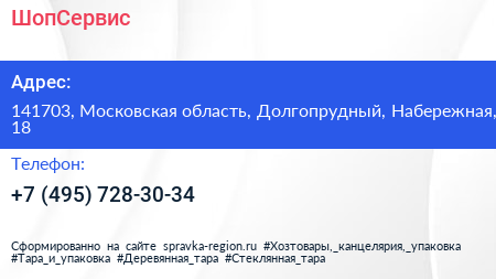 ШопСервис по адресу 141703, Московская область, Долгопрудный, Набережная, 18 в дальнейшем Организация, размещена в следующих категориях: