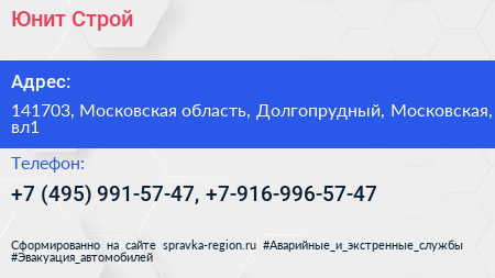 Юнит Строй по адресу 141703, Московская область, Долгопрудный, Московская, вл1 в дальнейшем Организация, размещена в следующих категориях: