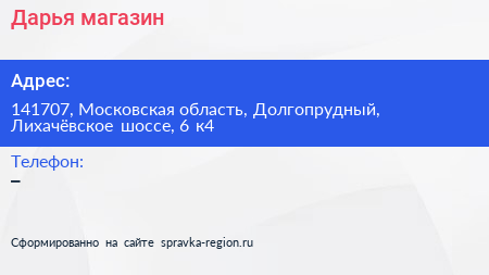 Дарья, магазин по адресу 141707, Московская область, Долгопрудный, Лихачёвское шоссе, 6 к4 в дальнейшем Организация, размещена в следующих категориях: