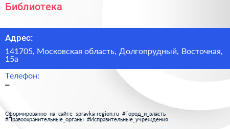 Библиотека по адресу 141705, Московская область, Долгопрудный, Восточная, 15а в дальнейшем Организация, размещена в следующих категориях:
