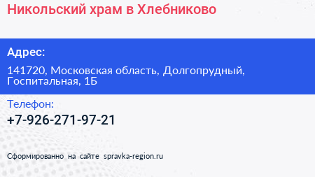 Никольский храм в Хлебниково по адресу 141720, Московская область, Долгопрудный, Госпитальная, 1Б в дальнейшем Организация, размещена в следующих категориях: