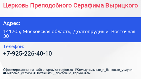 Церковь Преподобного Серафима Вырицкого по адресу 141705, Московская область, Долгопрудный, Восточная, 30 в дальнейшем Организация, размещена в следующих категориях: