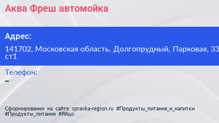 Аква Фреш, автомойка по адресу 141702, Московская область, Долгопрудный, Парковая, 33 ст1 в дальнейшем Организация, размещена в следующих категориях: