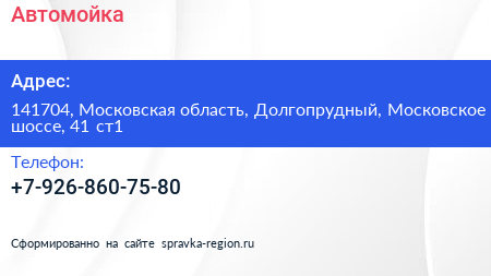 Автомойка по адресу 141704, Московская область, Долгопрудный, Московское шоссе, 41 ст1 в дальнейшем Организация, размещена в следующих категориях: