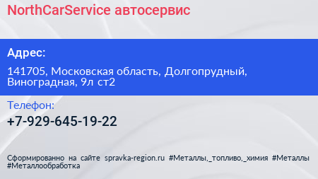 NorthCarService, автосервис по адресу 141705, Московская область, Долгопрудный, Виноградная, 9л ст2 в дальнейшем Организация, размещена в следующих категориях: