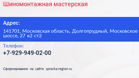 Шиномонтажная мастерская по адресу 141701, Московская область, Долгопрудный, Московское шоссе, 27 к2 ст2 в дальнейшем Организация, размещена в следующих категориях: