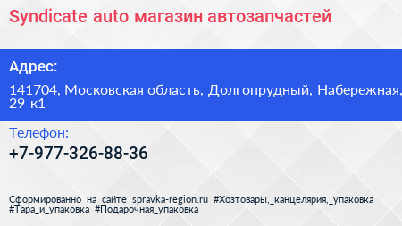Syndicate-auto, магазин автозапчастей по адресу 141704, Московская область, Долгопрудный, Набережная, 29 к1 в дальнейшем Организация, размещена в следующих категориях: