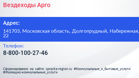 Вездеходы Арго по адресу 141703, Московская область, Долгопрудный, Набережная, 22 в дальнейшем Организация, размещена в следующих категориях:
