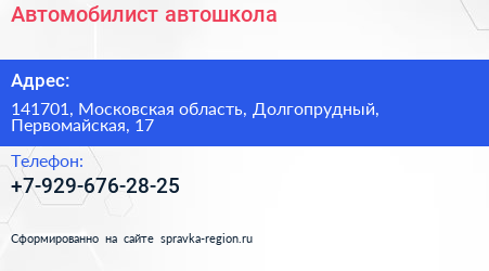 Автомобилист, автошкола по адресу 141701, Московская область, Долгопрудный, Первомайская, 17 в дальнейшем Организация, размещена в следующих категориях: