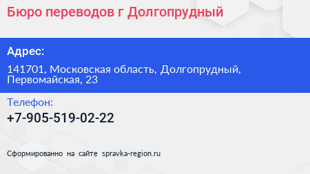 Бюро переводов, г. Долгопрудный по адресу 141701, Московская область, Долгопрудный, Первомайская, 23 в дальнейшем Организация, размещена в следующих категориях: