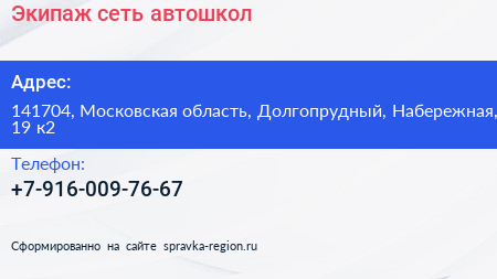 Экипаж, сеть автошкол по адресу 141704, Московская область, Долгопрудный, Набережная, 19 к2 в дальнейшем Организация, размещена в следующих категориях: