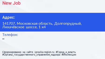 New Job по адресу 141707, Московская область, Долгопрудный, Лихачёвское шоссе, 1 к4 в дальнейшем Организация, размещена в следующих категориях: