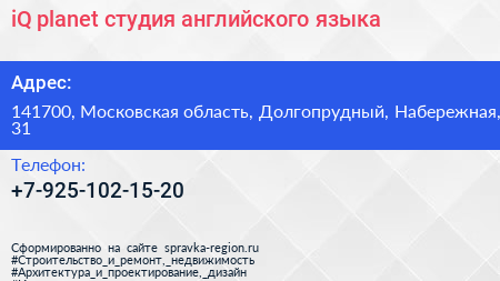 iQ planet, студия английского языка по адресу 141700, Московская область, Долгопрудный, Набережная, 31 в дальнейшем Организация, размещена в следующих категориях: