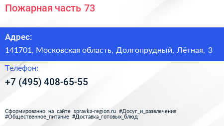 Пожарная часть №73 по адресу 141701, Московская область, Долгопрудный, Лётная, 3 в дальнейшем Организация, размещена в следующих категориях: