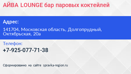 АЙВА LOUNGE, бар паровых коктейлей по адресу 141704, Московская область, Долгопрудный, Октябрьская, 20а в дальнейшем Организация, размещена в следующих категориях: