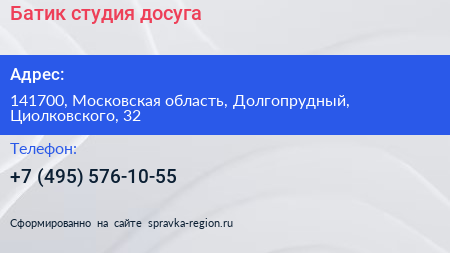 Батик, студия досуга по адресу 141700, Московская область, Долгопрудный, Циолковского, 32 в дальнейшем Организация, размещена в следующих категориях: