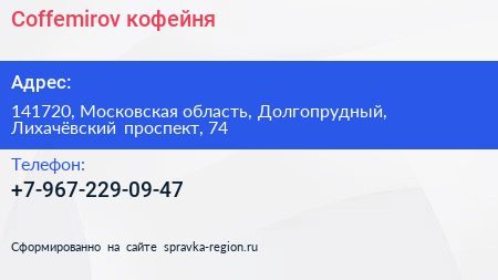Coffemirov, кофейня по адресу 141720, Московская область, Долгопрудный, Лихачёвский проспект, 74 в дальнейшем Организация, размещена в следующих категориях: