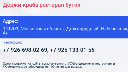 Держи краба, ресторан-бутик по адресу 141703, Московская область, Долгопрудный, Набережная, 4а в дальнейшем Организация, размещена в следующих категориях: