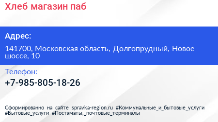 Хлеб, магазин-паб по адресу 141700, Московская область, Долгопрудный, Новое шоссе, 10 в дальнейшем Организация, размещена в следующих категориях: