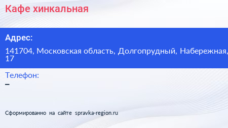 Кафе-хинкальная по адресу 141704, Московская область, Долгопрудный, Набережная, 17 в дальнейшем Организация, размещена в следующих категориях:
