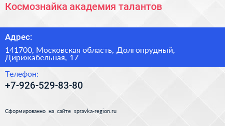 Космознайка, академия талантов по адресу 141700, Московская область, Долгопрудный, Дирижабельная, 17 в дальнейшем Организация, размещена в следующих категориях: