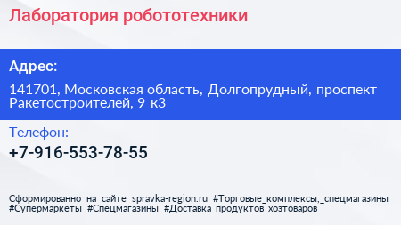 Лаборатория робототехники по адресу 141701, Московская область, Долгопрудный, проспект Ракетостроителей, 9 к3 в дальнейшем Организация, размещена в следующих категориях: