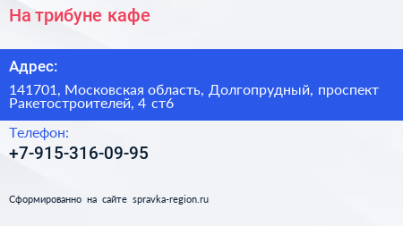 На трибуне, кафе по адресу 141701, Московская область, Долгопрудный, проспект Ракетостроителей, 4 ст6 в дальнейшем Организация, размещена в следующих категориях: