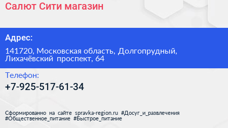 Салют Сити, магазин по адресу 141720, Московская область, Долгопрудный, Лихачёвский проспект, 64 в дальнейшем Организация, размещена в следующих категориях: