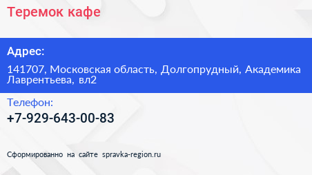 Теремок, кафе по адресу 141707, Московская область, Долгопрудный, Академика Лаврентьева, вл2 в дальнейшем Организация, размещена в следующих категориях:
