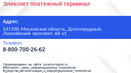 Элекснет, платежный терминал по адресу 141700, Московская область, Долгопрудный, Лихачёвский проспект, 68 к1 в дальнейшем Организация, размещена в следующих категориях: