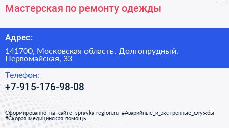 Мастерская по ремонту одежды по адресу 141700, Московская область, Долгопрудный, Первомайская, 33 в дальнейшем Организация, размещена в следующих категориях: