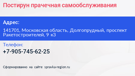 Постирун, прачечная самообслуживания по адресу 141701, Московская область, Долгопрудный, проспект Ракетостроителей, 9 к3 в дальнейшем Организация, размещена в следующих категориях:
