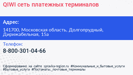 QIWI, сеть платежных терминалов по адресу 141700, Московская область, Долгопрудный, Дирижабельная, 15а в дальнейшем Организация, размещена в следующих категориях: