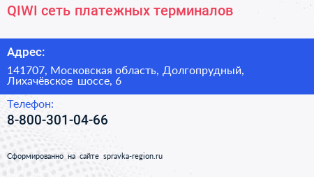 QIWI, сеть платежных терминалов по адресу 141707, Московская область, Долгопрудный, Лихачёвское шоссе, 6 в дальнейшем Организация, размещена в следующих категориях: